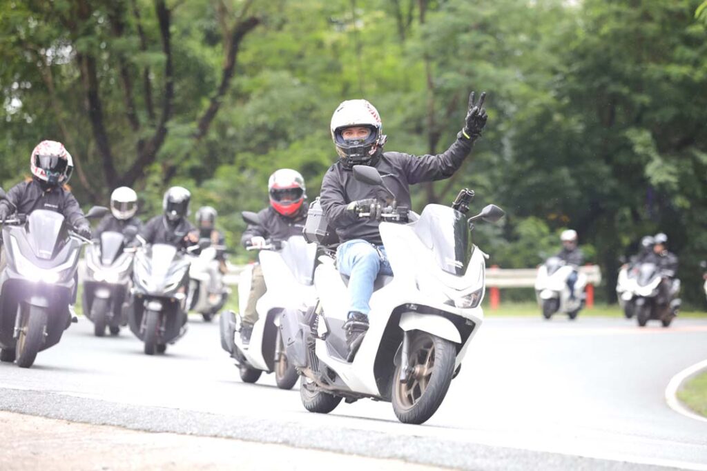 A group of riders on Honda PCX160 scooters cruise together along a countryside road in Tanay during the PCXceptional Ride event.