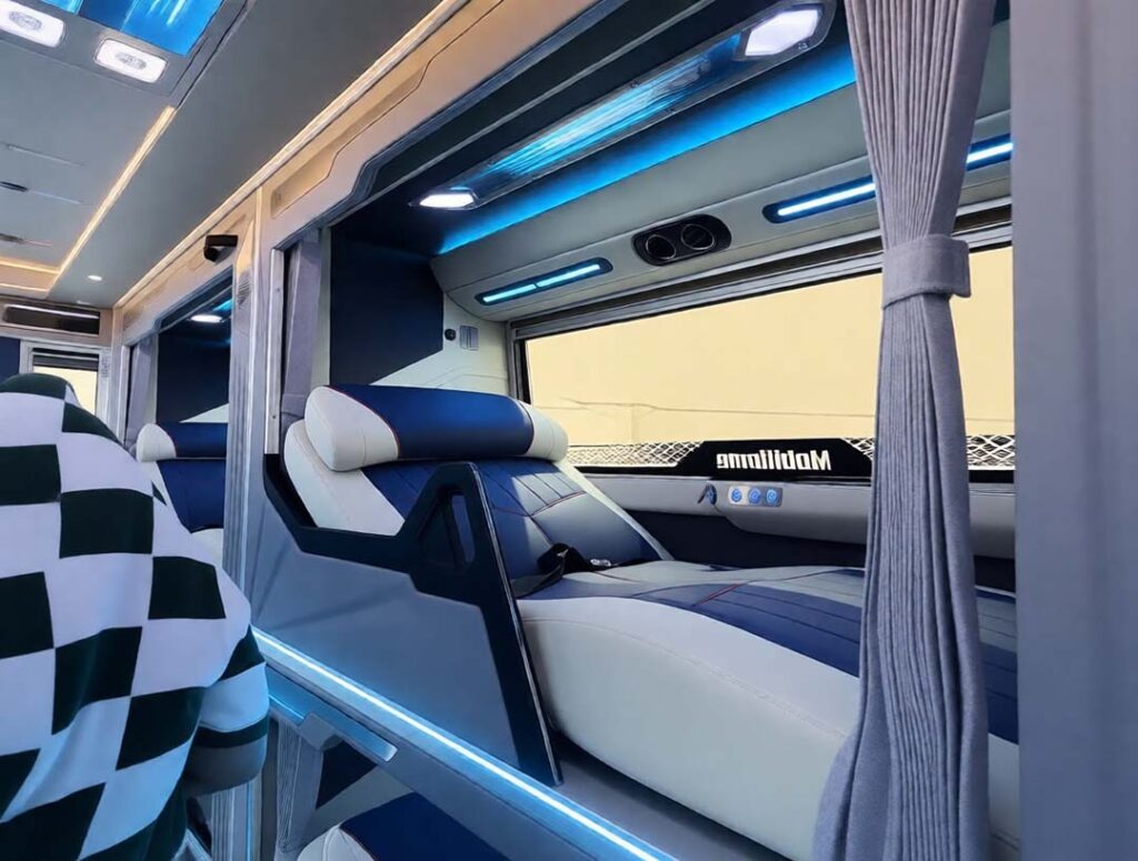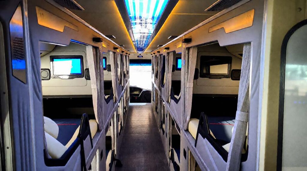 The bus is fitted with 20 individual sleeper cabins. Cagsawa Travel and Tours provided specific design inputs for the interiors to enhance passenger comfort and privacy. Each cabin uses premium materials and includes an LCD entertainment screen, personal reading light, and Type-A and Type-C charging ports. The bus also comes with an onboard toilet, while UV ceiling lights and ambient lighting add to the overall cabin atmosphere.